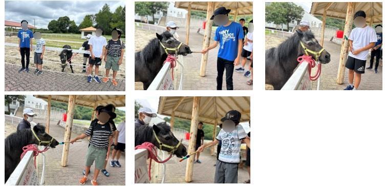 そこでは黒いポニーの「クロスケくん」に出会いました。クロスケくんは27歳、人間でいうと80歳くらいになるおじいちゃん馬です。おとなしい性格で、生徒たちは興味津々に近づいていきました。最初は少し怖がりながら恐る恐る手を伸ばす生徒もいましたが、みんな笑顔で記念撮影をすることができました。