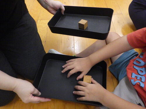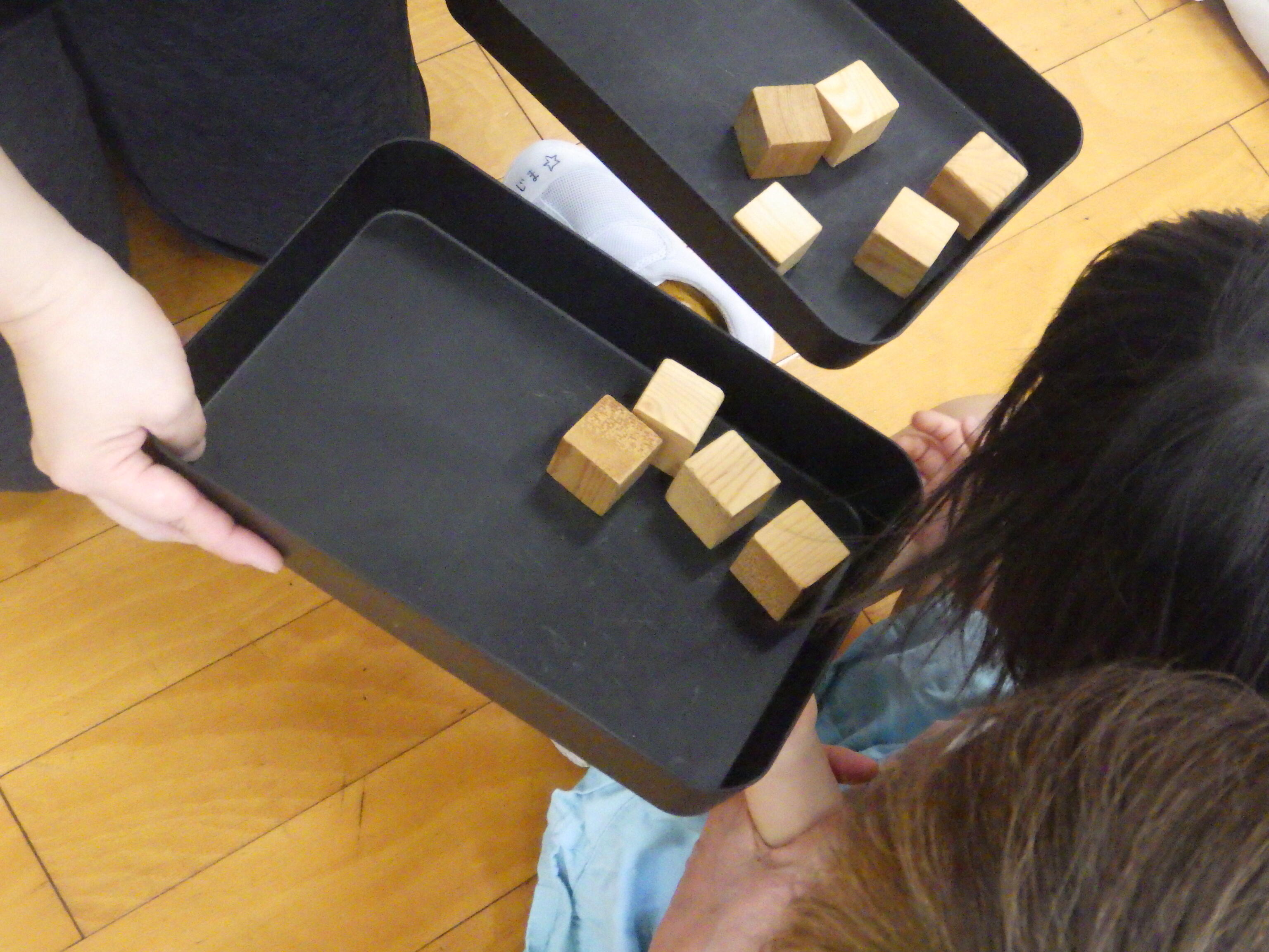 演説を聞いた子どもたちは、木のキューブを投票用紙として投票しました。
