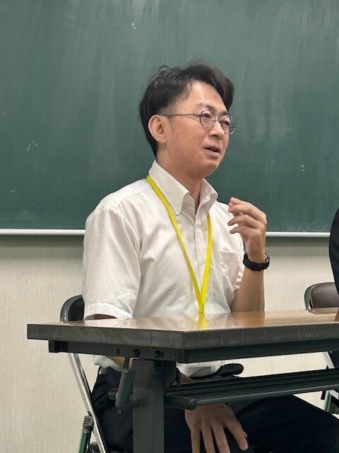 ゆうちょ銀行大阪貯金事務センター内にあるマッサージルームでヘルスキーパーとしてご勤務の澤井貴行先生からは、ヘルスキーパーの業務の実際をお話しいただくとともに、現在のご自身が行っている治療のうち、卒業後に新たに学んだことは1~2割で、大半は本校で学んだ実技が基本になっているので、本校での実技の時間を大事にしてほしいなどと語っていただきました。