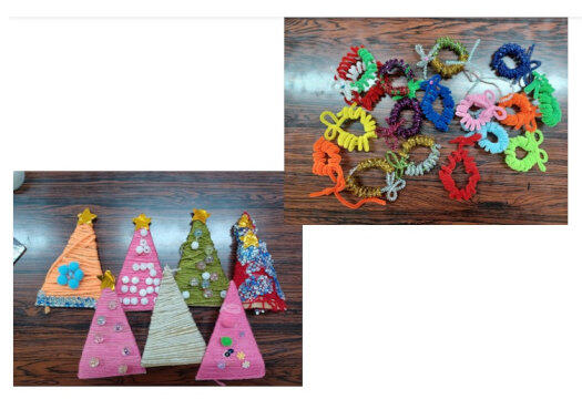 13号室に集合して、段ボールのツリーの型に毛糸でくるくると巻いて作るツリーと、モールでリースを作成。