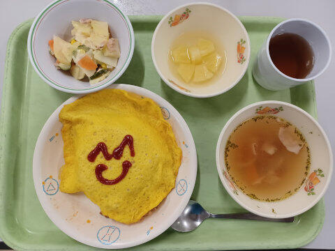 11月11日の夕食は、オムライスとツナポテトサラダ、コンソメスープ、パイン缶詰めでした。
