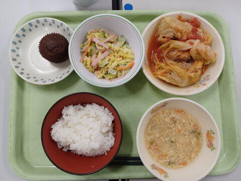 11月18日の夕食は、ロールキャベツ(トマト味)、マカロニサラダ、卵スープ、ミニショコラマフィンでした。