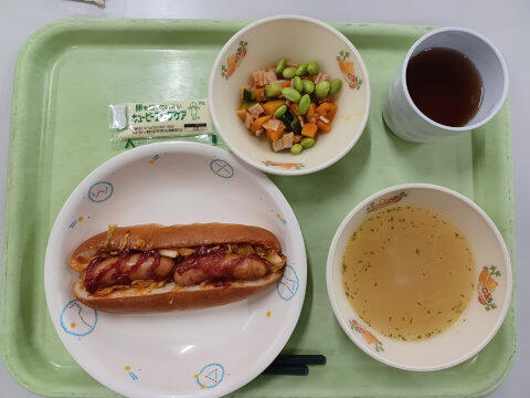 11月19日の朝食は、ホットドック、かぼちゃのサラダ、オニオンスープでした。