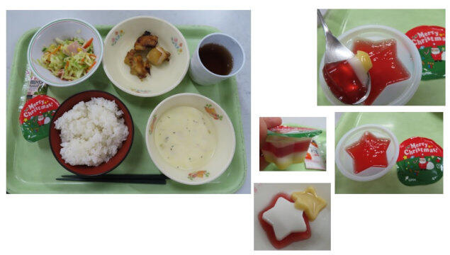 ごはん、グリルチキンハニーマスタード、野菜とハムのサラダ、かぼちゃと豆のスープ、サンタの3色デザートに、みんな大好評!