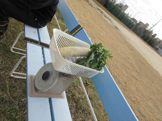 それぞれの生徒が選んだ大根を計りにのせて重量をはかりました。