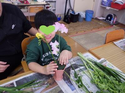 講師の説明を聞きながら、花をそっと触って確かめ、自分のペースで作品づくりを進めていきました。必要に応じて、花の触察も行い、安心して活動に取り組むことができました。