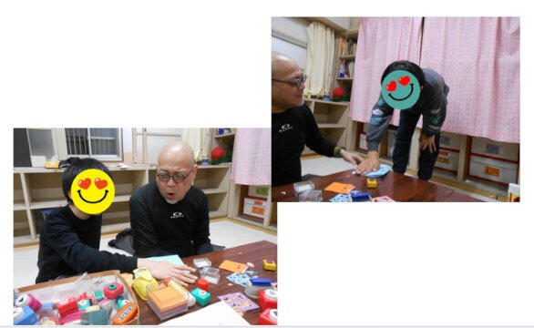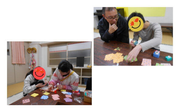 折り紙の型抜きは力が必要で、「ソーレ―、ポン!」の掛け声で挑戦しているうちに、コツをつかんで次々といろんな形が完成していきました。