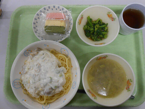 3月3日のお雛祭りの日の夕食は、鶏肉のクリームパスタ、菜の花の辛し和え、アサリとキャベツのスープ、そしてひなケーキまで、みんなの笑顔が広がるメニューでした。