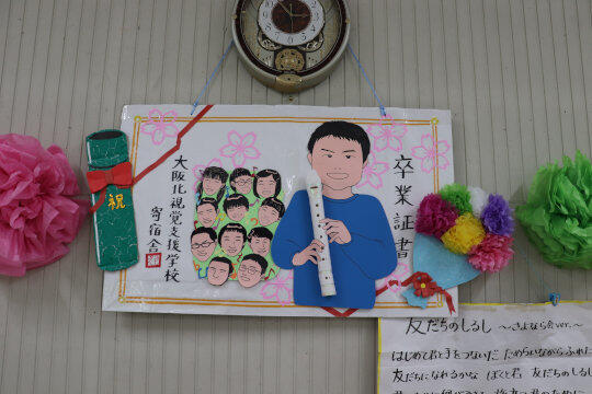 今年の装飾は、卒業生を中心に、寄宿舎舎生全員の似顔が描かれた特大の卒業証書。