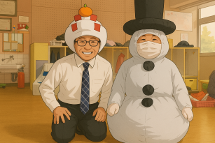「今日から、冬休みが明けて学校の後期が再開しましてな、児童生徒集会と幼稚部の新年のあいさつ会がおましてん。その時のかぶりり物で、雪だるまが教頭はん、鏡もちがワテでんねん」