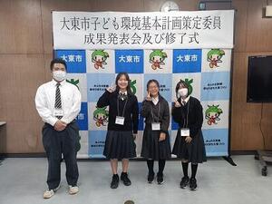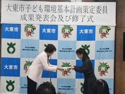 発表終了後、市長から修了証を受け取りました。自分たちの発表が、大東市の今後10年間の環境基本計画に反映されます。