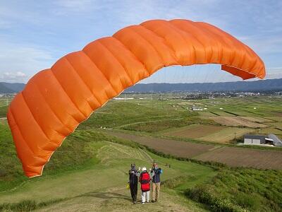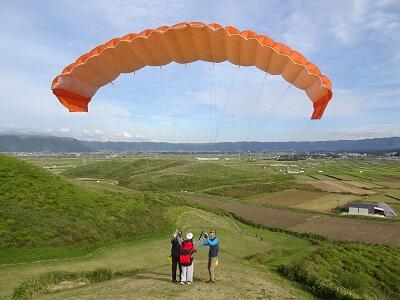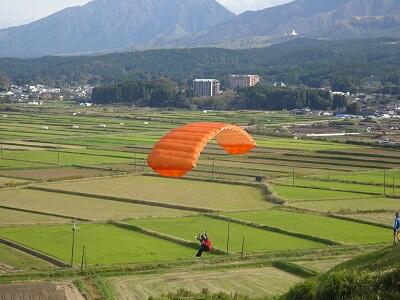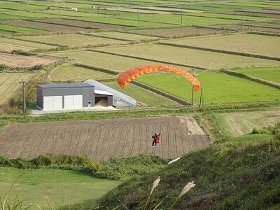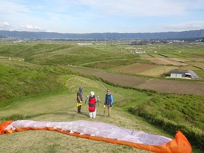 私は軽トラに乗って、マウンテンバイク班の後をおっかけましたが、山頂近くでパラグライダー班に遭遇。びっくりするほど高いところから飛んでました。気持ちよさそうでした!!
