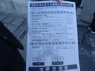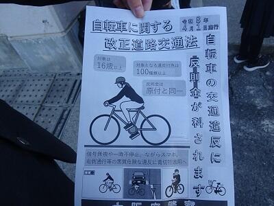 本校生徒会が四条畷警察署と連携して、登校してくる本校性に「自転車に関する改正道路交通法」について、また、「ヘルメット着用推進」についての啓発用のチラシ配布の取組みを行いました。SafetyBicycle推進校に指定されて初の試みです。