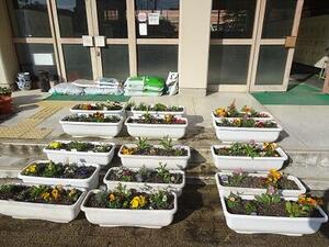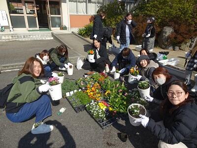 PTAのみなさまが卒業式で使うプランターのお花植えに集まりました。