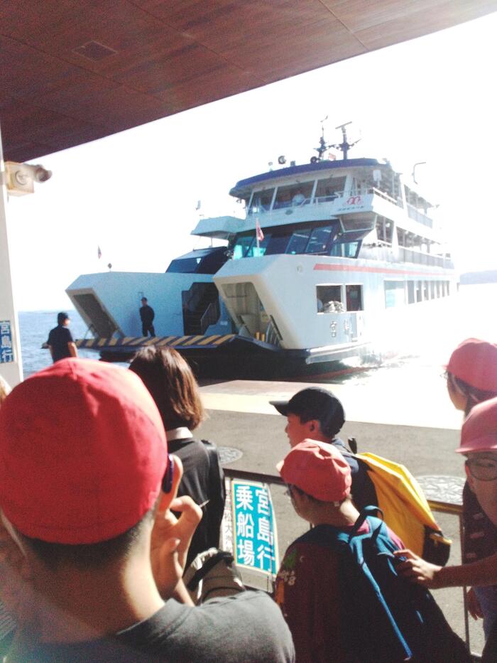 フェリーに乗って宮島へ行きます。大変混みあっています。