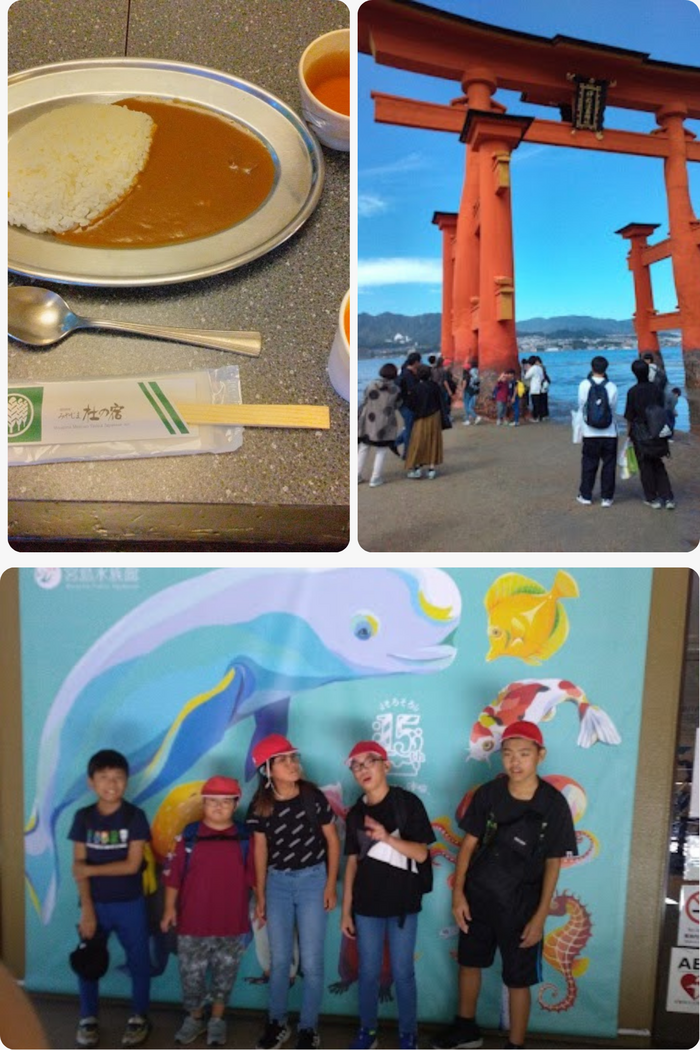 厳島神社、宮島水族館の見学、昼食のあとは潮が引いており鳥居まで歩くことができました。