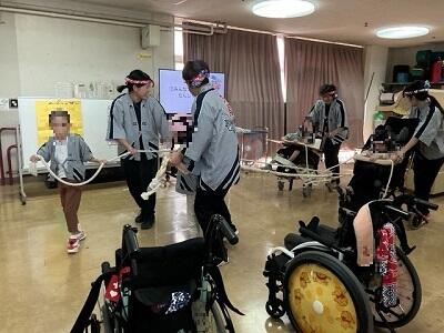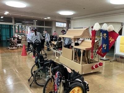 だんじり祭りは、子どもたちにとって身近に感じられる地域の伝統行事です。授業では、実際に法被を着て鉢巻きを巻き、本番さながらの雰囲気の中で活動しました。鳴り物の音に合わせて、自分なりの方法で「そーりゃー」と楽しんで掛け声を発しながら、友だちと協力して手作りのだんじりを曳くことができました。