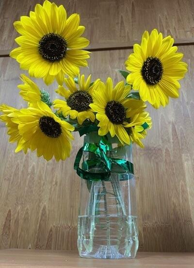 10月3日(金)の朝、HRの時間に高等部2年生より、ペットボトルの花瓶に生けられたひまわりをいただきました。