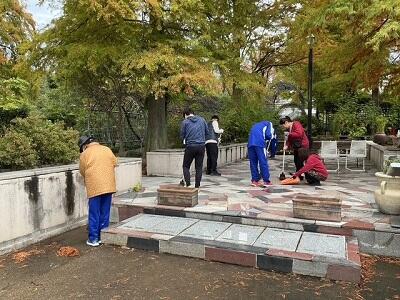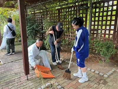 当日は、同センター友の会や堺仁徳ライオンズクラブ、大仙校区自治連合会、堺市公園協会など、地域の皆さんと一緒に活動しました。生徒たちは、たくさんの落ち葉を集めたり、園内の掃き掃除をしたりと、協力しながら一生懸命取り組みました。