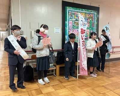 高等部では、今年度2学期から定期的に「あいさつ運動」に取り組んでいます。各学年から有志の生徒を募り、輪番で8時50分からバスホールにて実施しています。