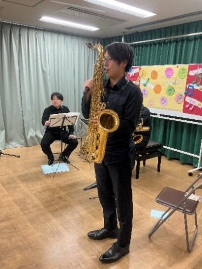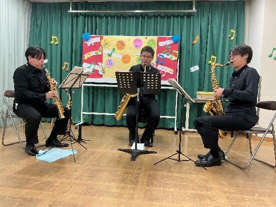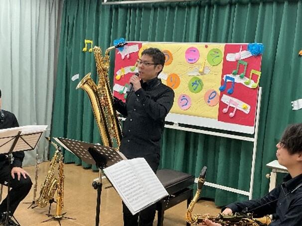 はじめにバリトン、テナー、アルト、ソプラノサクソフォーンの各楽器の紹介があり、楽器の特徴やソロ演奏を聴きました。なじみのあるアニメの曲や秋冬の季節曲、サクソフォーンのために作曲された曲など様々なジャンルの楽曲をたっぷりと45分間、みんな集中して聴き入っていました。子どもたちは、サクソフォーンの三重奏の美しいハーモニーや迫力のある素晴らしい演奏に、目を輝かせ生き生きとした表情をしていました。