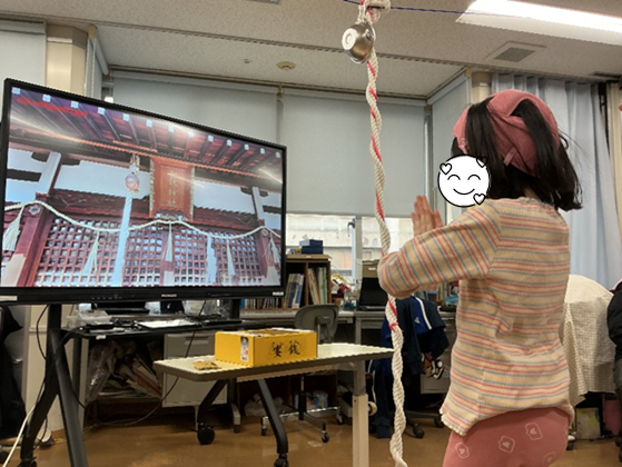 456年生では教室内に大きな鈴と賽銭箱が設置され、新年の初詣体験をしました。お賽銭を投げてお願い事をしたり、おみくじを引いたりしてお正月気分を味わいました。