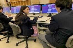アルゴリズムとプログラミングの授業です。モニターに示された指示に従って体を動かすことでアルゴリズムについて理解をしました。その後、プログラミングの記入ルールについてペアワークでまとめました。