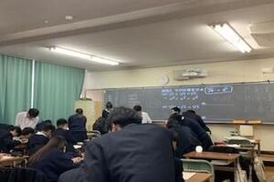 指数法則を用いて計算する授業です。説明の後は演習をしながら友達同士で教え合いもしながら、 解けるようになりました。