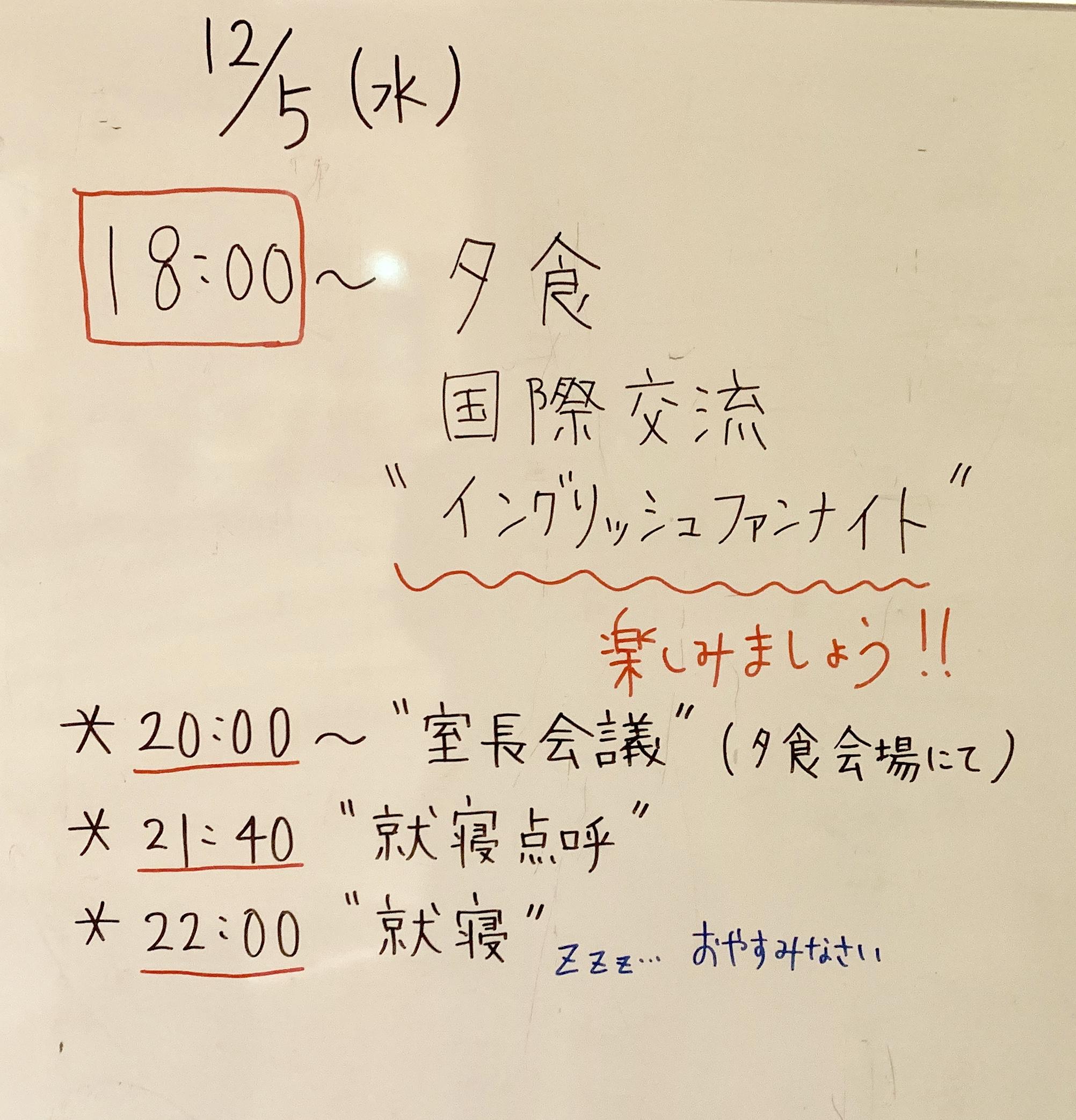 夕食:各テーブルに外国人の方がつき、一緒に夕食を取りながら国際交流を行いました。