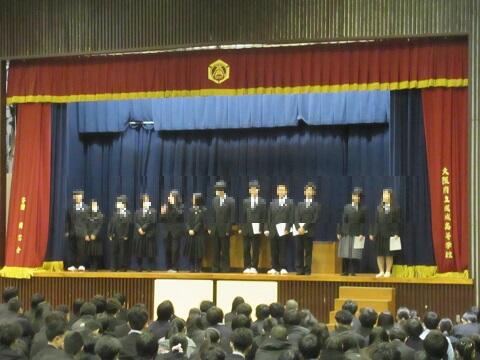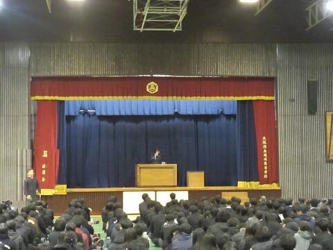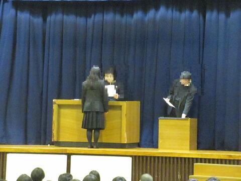 12月24日(水)終業式を行いました。校長先生のお話の後、部活動表彰と生徒会役員の任命式を行いました。
