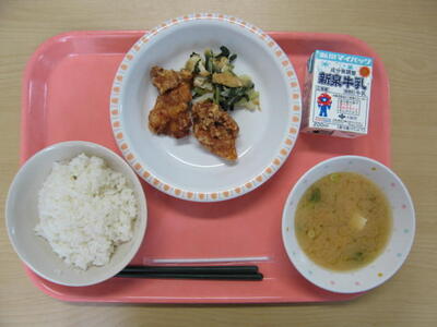 9月22日(月)は、牛乳、ごはん、とりのから揚げ、青菜の煮びたし、みそ汁、でした。