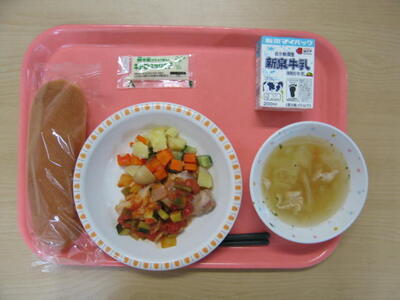 9月24日(水)は、牛乳、コッペパン、チキンのラタトゥイユ風ソースがけ、マセドアンサラダ、ジュリエンヌスープ、でした。