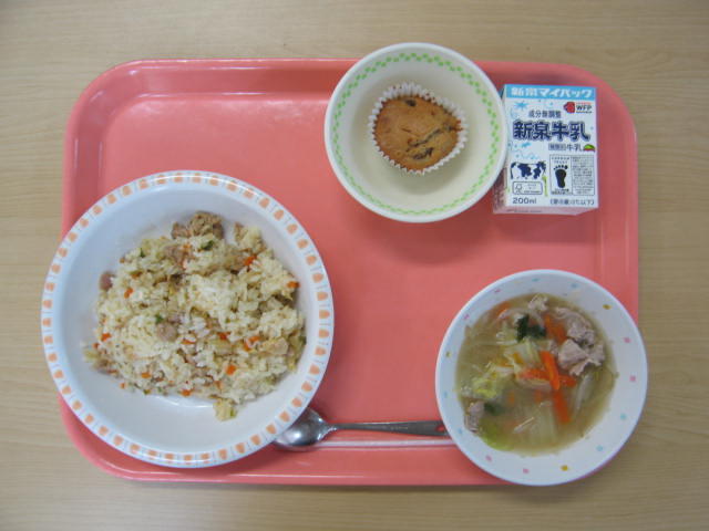 10月20日(月)は、牛乳、チャーハン、みそスープ、黒糖バナナマフィン、でした。