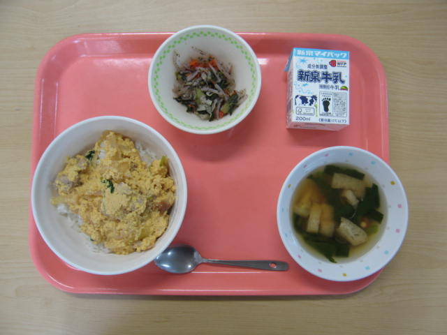 10月23日(木)は、牛乳、親子丼、ゆかり炒め、すまし汁、でした。