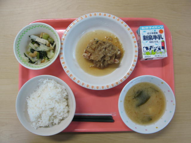 10月24日(金)は、牛乳、ごはん、魚とごぼうの揚げ煮、小松菜の煮びたし、みそ汁、でした。