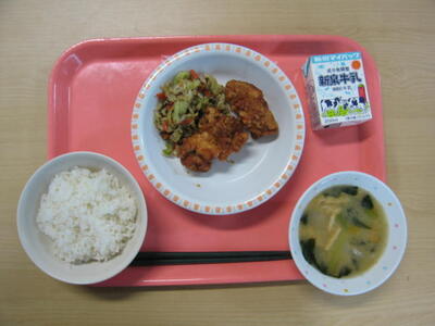 10月22日(水)は、牛乳、ごはん、とり肉のから揚げ甘辛風、キャベツの塩昆布炒め、みそ汁、でした。