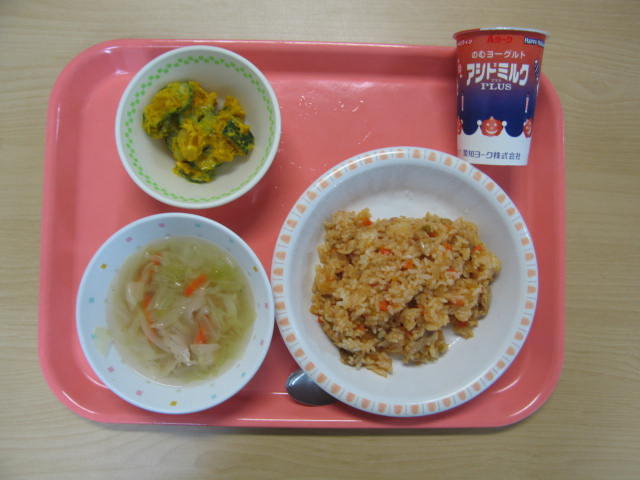 10月31日(金)は、飲むヨーグルト、チキンライス、カボチャのサラダ、豚肉とキャベツのスープ、でした。