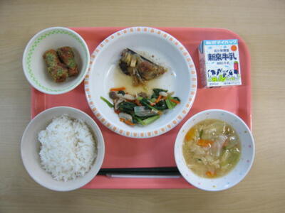 10月28日(火)は、牛乳、ごはん、さんまのしょうが煮、ちくわのいそべ揚げ、青菜ときのこのお浸し、みそ汁、でした。