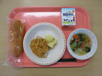 10月29日(水)は、牛乳、パンプキンパン、チキンソテーカレーソース、じゃがバター、野菜スープ、でした。