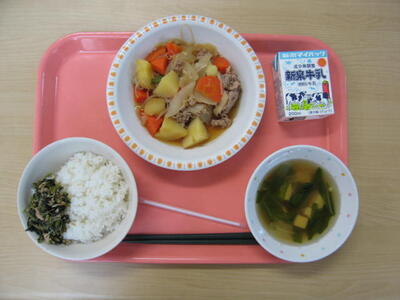 10月30日(木)は、牛乳、ごはん、青菜とツナのふりかけ、肉じゃが、すまし汁、でした。