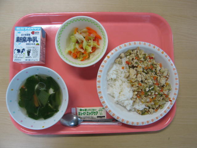 11月5日(水)は、牛乳、ガパオライス、ゆで野菜、チンゲン菜と豆腐のスープ、でした。
