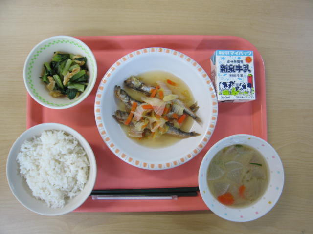 11月7日(金)は、牛乳、ごはん、ししゃもの甘酢あん、小松菜とあげの炒めもの、根菜のみそ汁、でした。
