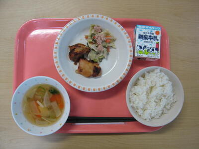 11月6日(木)は、牛乳、ごはん、チキンのソース焼き、ゴボウサラダ、五目汁、でした。