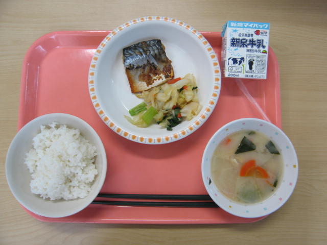 1月9日(金)は、牛乳、ごはん、さばの香味焼き、青菜の和えもの、白みそ雑煮、すまし汁、でした。