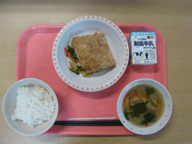 1月13日(火)は、牛乳、ごはん、松風焼き、おかか和え、吉野仕立て汁、でした。