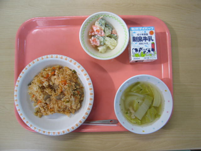 1月16日(金)は、牛乳、チキンライス、ポテトサラダ、豚肉と野菜のスープ、でした。