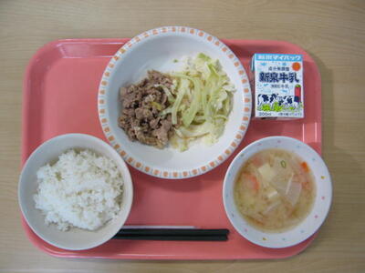 1月15日(木)は、牛乳、ごはん、豚肉の焼肉風炒め、蒸し野菜、具だくさんみそ汁、でした。