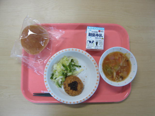 1月20日(火)は、牛乳、バーガーパン、ミンチカツ、キャベツのソテー、ミネストローネ、でした。