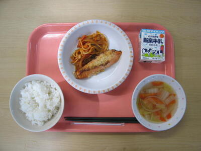 1月21日(水)は、牛乳、ごはん、鮭のパン粉焼き、スパゲティソテー、野菜スープ、でした。