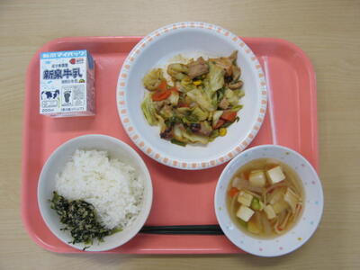 1月22日(木)は、牛乳、ごはん、青菜とツナのふりかけ、けいちゃん焼き、五目汁、でした。